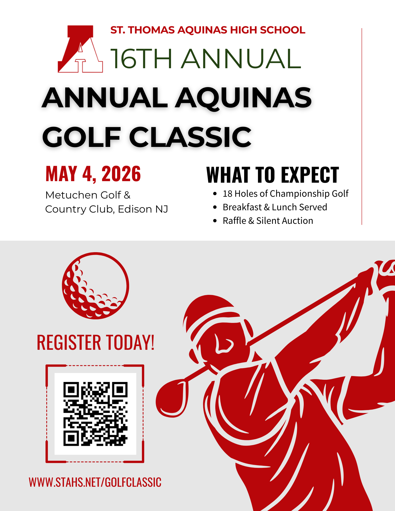 St. Thomas Aquinas High School will be hosting their 16th Annual Aquinas Golf Classic on May 4th, 2026 at the Metuchen Golf & Country Club, Edison, NJ
